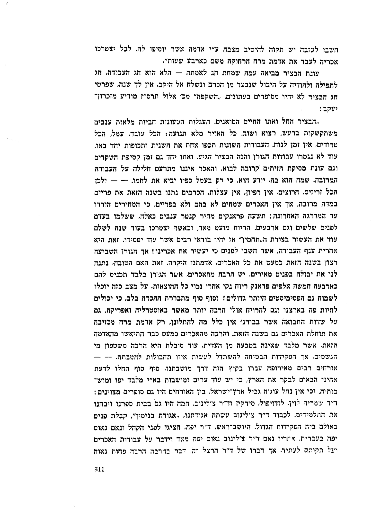 ״הבציר החל ואתו החיים הסואנים. העגלות הטעונות חביות מלאות ענבים משתקשקות ברעש, רצוא ושוב. כל האויר מלא תנועה; הכל עובד, עמל, הכל טרודים, אין זמן לנוח. העבודות השונות תכפו אחת את השנית ותכופות יחד באו. עוד לא נגמרו עבודות הגורן והנה הבציר הגיע. ואתו יחד גם זמן קטיפת השקדים וגם עונת מסיקת הזיתים קרובה לבוא. והאכר איננו מתרעם חלילה על העבודה המרובה. שמח הוא בה. יודע הוא, כי רק בעמל כפיו יביא את לחמו. — — ולכן הכל זריזים, חרוצים, אין רפיון, אין עצלות. הכרמים נתנו בשנה הזאת את פריים במדה מרובה, אך אין האכרים שמחים לא בהם ולא בפריים, כי המחירים הורדו עד המדרגה האחרונה: תשעה פראנקים מחיר קנטר ענבים כאלה, ששלמו בעדם לפנים שלשים וגם ארבעים. הריוח מועט מאד, וכאשר יצטרכו בעוד שנה לשלם עוד את העשור בצורת ה״תחמין״ אז יהיו בודאי רבים אשר עוד יפסידו. זאת היא אחרית ענף העבודה, אשר חשבו לפנים כי יעשיר את אכרינו! אך הגורן השביעה רצון בשנה הזאת כמעט את כל האכרים. אדמתנו היקרה, זאת האם הטובה, נתנה לנו את יבולה בפנים מאירים. יש הרבה מהאכרים, אשר הגורן בלבד תכניס להם כארבעה חמשה אלפים פראנק ריוח נקי אחרי נכוי כל ההוצאות. על מצב כזה יוכלו לשמוח גם הפסימיסטים היותר גדולים! וסוף סוף מתבררת ההכרה בלב, כי יכולים לחיות פה בארצנו וגם להרויח אולי הרבה יותר מאשר באוסטרליה ואפריקה. גם על שדות התבואה אשר בבורג׳ אין כלל מה להתלונן, רק אדמת מרח מכזיבה את תוחלת האכרים גם בשנה הזאת. והרבה מהאכרים כמעט כבר התייאשו מהאדמה הזאת, אשר מלבד שאינה בטבעה מן העדית, עוד סובלת היא הרבה משטפון מי הגשמים. אך הפקידות הבטיחה להשתדל לעשות איזו תחבולות להטבתה. — — אורחים רבים מאירופה עברו בקיץ הזה דרך מושבתנו. סוף סוף החלו לדעת אחינו הבאים לבקר את הארץ, כי יש עוד ערים ומושבות בא״י מלבד יפו ומושבותיה, וכי אין נחל עוג׳ה גבול ארץ־ישראל. בין האורחים היו גם סופרים מצוינים: ד״ר שמריה לוין, לודויפול, סירקין וד״ר צ׳לינוב. המה היו גם בבית ספרנו ויבחנו את התלמידים. לכבוד ד״ר צ׳לינוב עשתה אגודתנו, ״אגודת בנימין״, קבלת פנים באולם בית הפקידות הגדול. היושב־ראש, ד״ר יפה, הציגו לפני הקהל ונאם נאום יפה בעברית. אחריו נאם ד״ר צ׳לינוב נאום יפה מאד וידבר על עבודות האכרים ועל תקותם לעתיד. אך חברו של ד״ר הרצל זה, דבר בהרבה הרבה פחות גאוה