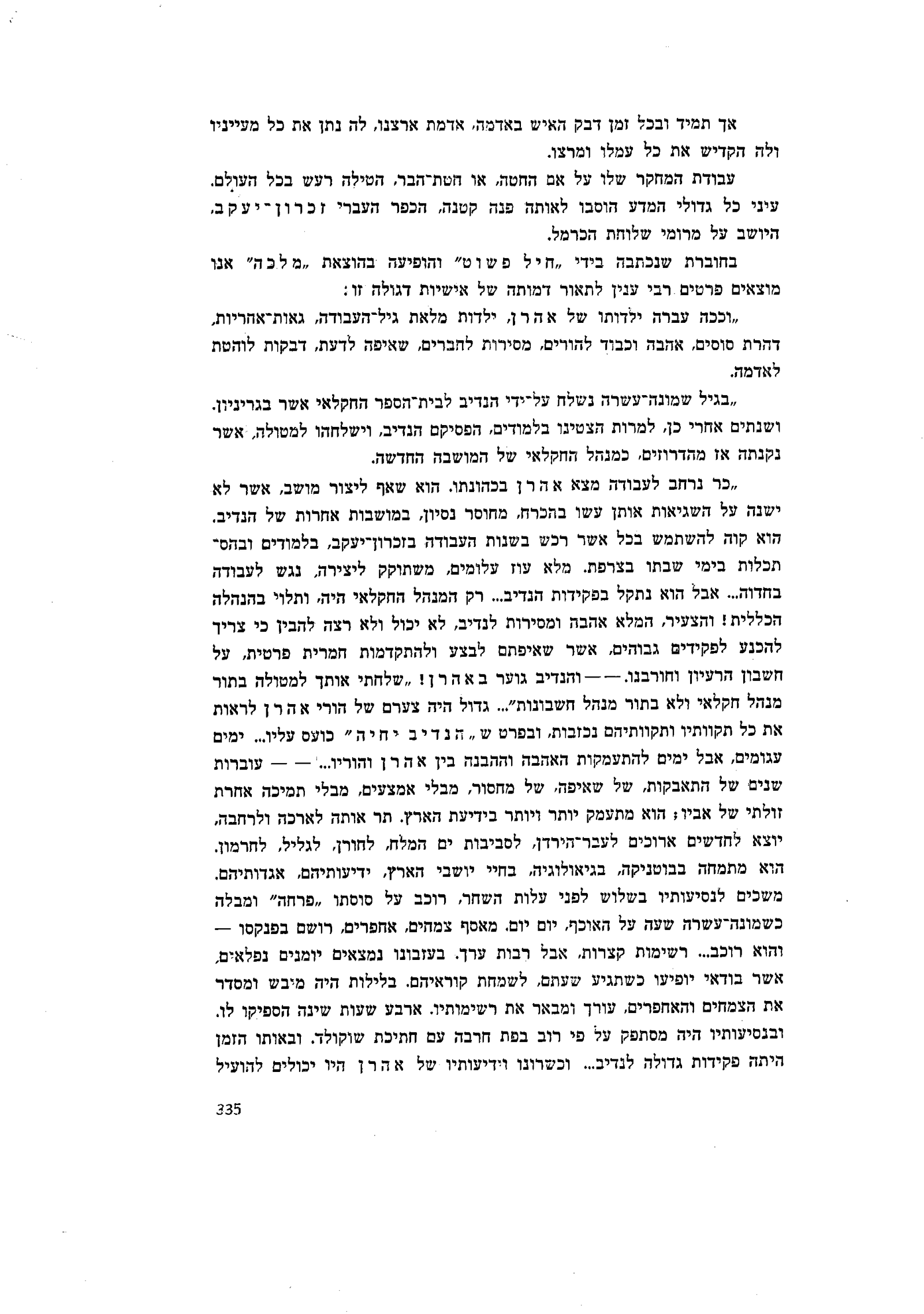 אך תמיד ובכל זמן דבק האיש באדמה, אדמת ארצנו, לה נתן את כל מעייניו ולה הקדיש את כל עמלו ומרצו.