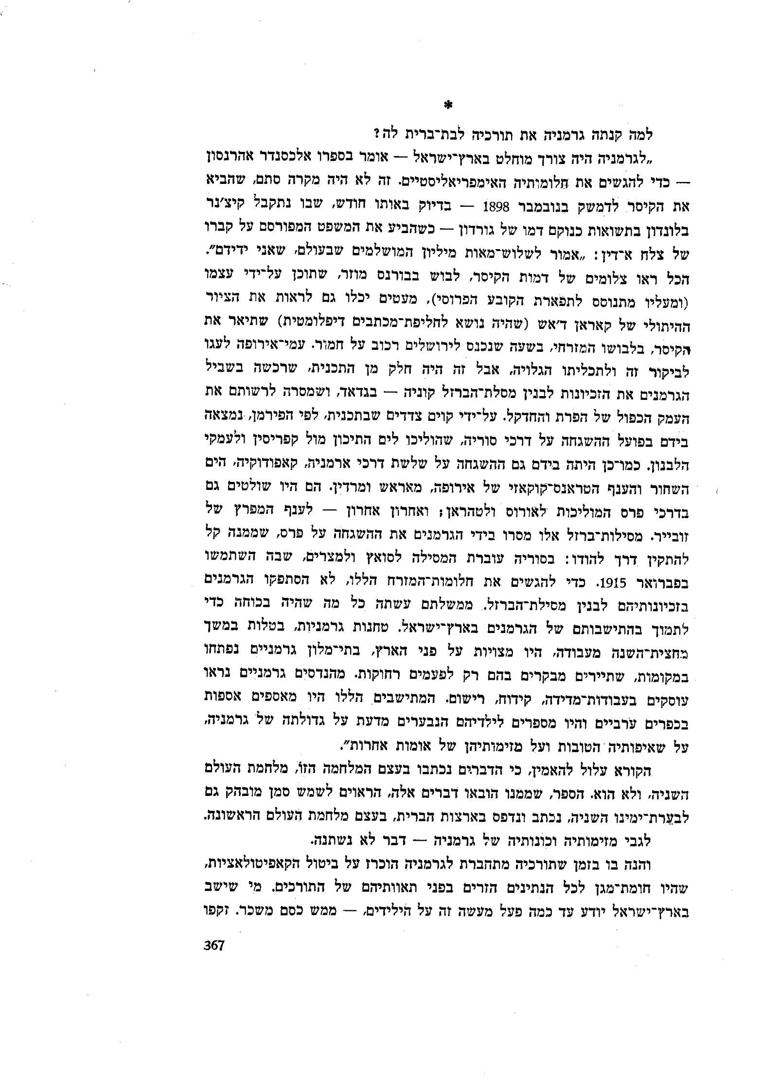 ״לגרמניה היה צורך מוחלט בארץ־ישראל — אומר בספרו אלכסנדר אהרנסון — כדי להגשים את חלומותיה האימפריאליסטיים. זה לא היה מקרה סתם, שהביא את הקיסר לדמשק בנובמבר 1898 — בדיוק באותו חודש, שבו נתקבל קיצ׳נר בלונדון בתשואות כנוקם דמו של גורדון — כשהביע את המשפט המפורסם על קברו של צלח א־דין: ״אמור לשלוש־מאות מיליון המושלמים שבעולם, שאני ידידם״. הכל ראו צלומים של דמות הקיסר, לבוש בבורנס מוזר, שתוכן על־ידי עצמו (ומעליו מתנוסס לתפארת הקובע הפרוסי), מעטים יכלו גם לראות את הציור ההיתולי של קאראן ד׳אש (שהיה נושא לחליפת־מכתבים דיפלומטית) שתיאר את הקיסר, בלבושו המזרחי, בשעה שנכנס לירושלים רכוב על חמור. עמי אירופה לעגו לביקור זה ולתכליתו הגלויה, אבל זה היה חלק מן התכנית, שרכשה בשביל הגרמנים את הזכיונות לבנין מסלת־הברזל קוניה־בגדאד, ושמסרה לרשותם את העמק הכפול של הפרת והחדקל. על־ידי קוים צדדים שבתכנית, לפי הפירמן, נמצאה בידם בפועל ההשגחה על דרכי סוריה, שהוליכו לים התיכון מול קפריסין ולעמקי הלבנון. כמו כן היתה בידם גם ההשגחה על שלשת דרכי ארמניה, קאפודוקיה, הים השחור והענף הטראנס־קוקאזי של אירופה, מאראש ומרדין. הם היו שולטים גם בדרכי פרס המוליכות לאורוס ולטהראן; ואחרון אחרון — לענף המפרץ של זובייר. מסילות־ברזל אלו מסרו בידי הגרמנים את ההשגחה על פרס, שממנה קל להתקין דרך להודו: בסוריה עוברת המסילה לסואץ ולמצרים, שבה השתמשו בפברואר 1915. כדי להגשים את חלומות־המזרח הללו, לא הסתפקו הגרמנים בזכיונותיהם לבנין מסילת־הברזל. ממשלתם עשתה כל מה שהיה בכוחה כדי לתמוך בהתישבותם של הגרמנים בארץ־ישראל. טחנות גרמניות, בטלות במשך מחצית־השנה מעבודה, היו מצויות על פני הארץ, בתי־מלון גרמניים נפתחו במקומות, שתיירים מבקרים בהם רק לפעמים רחוקות, מהנדסים גרמניים נראו עוסקים בעבודות־מדידה, קידוח, רישום. המתישבים הללו היו מאספים אספות בכפרים ערביים והיו מספרים לילדיהם הנבערים מדעת על גדולתה של גרמניה, על שאיפותיה הטובות ועל מזימותיהן של אומות אחרות״.