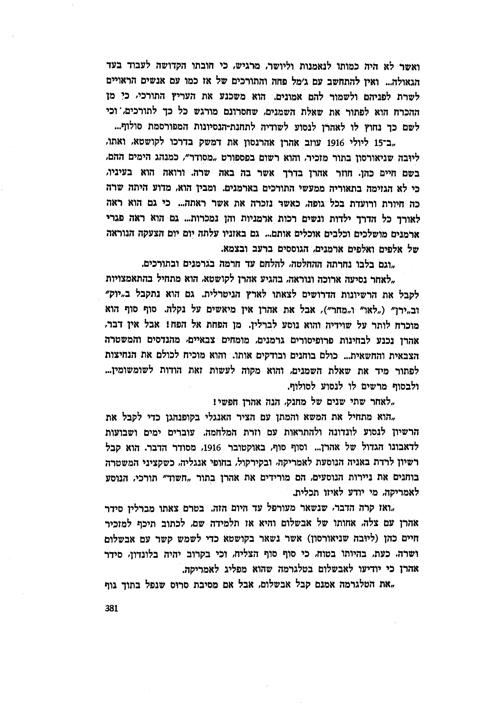 ואשר לא היה כמותו לנאמנות וליושר, מרגיש, כי חובתו הקדושה לעבוד בעד הגאולה... ואין להתחשב עם ג׳מל פחה, והתורכים של אז כמו עם אנשים הראויים לשרת לפניהם ולשמור להם אמונים. הוא משכנע את העריץ התורכי, כי מן ההכרח הוא לפתור את שאלת השמנים, שחסרונם מורגש כל כך לתורכים, וכי לשם כך נחוץ לו לאהרן לנסוע לשודיה לתחנת־הנסיונות המפורסמת סולוף...