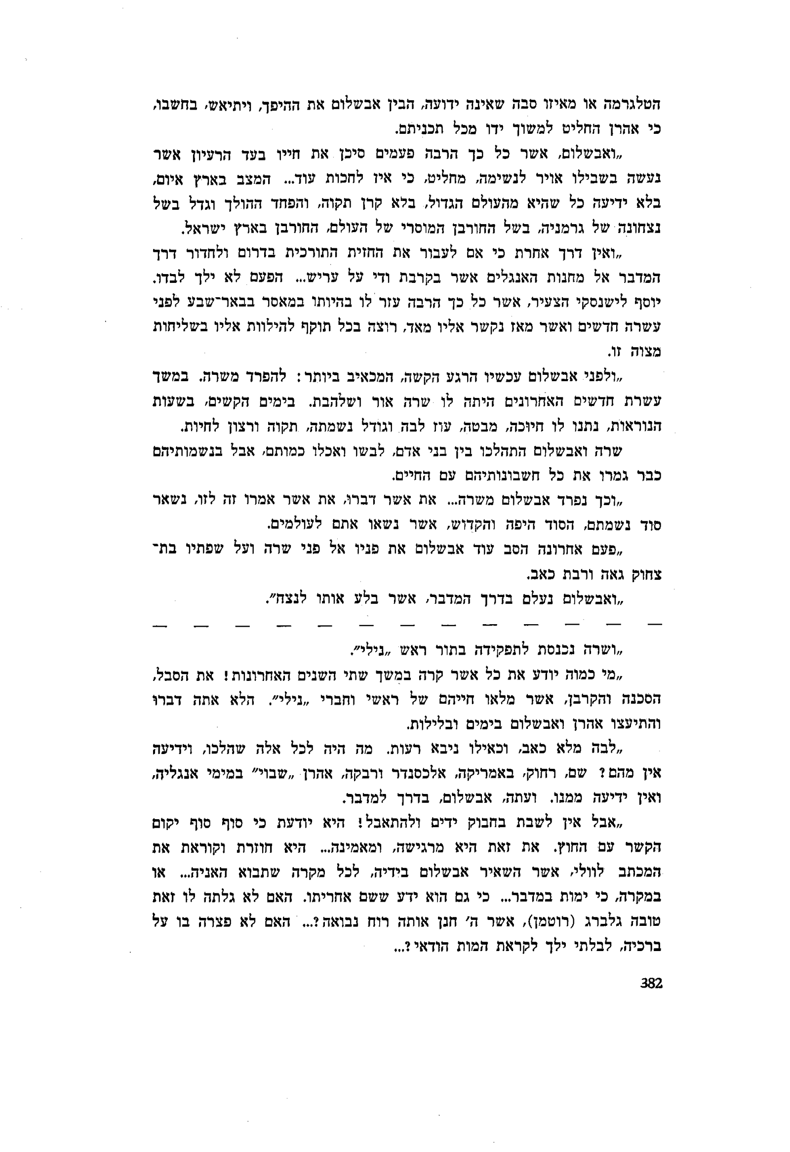 ״לבה מלא כאב, וכאילו ניבא רעות. מה היה לכל אלה שהלכו, וידיעה אין מהם? שם, רחוק, באמריקה, אלכסנדר ורבקה, אהרן ״שבוי״ במימי אנגליה, ואין ידיעה ממנו. ועתה, אבשלום, בדרך למדבר.