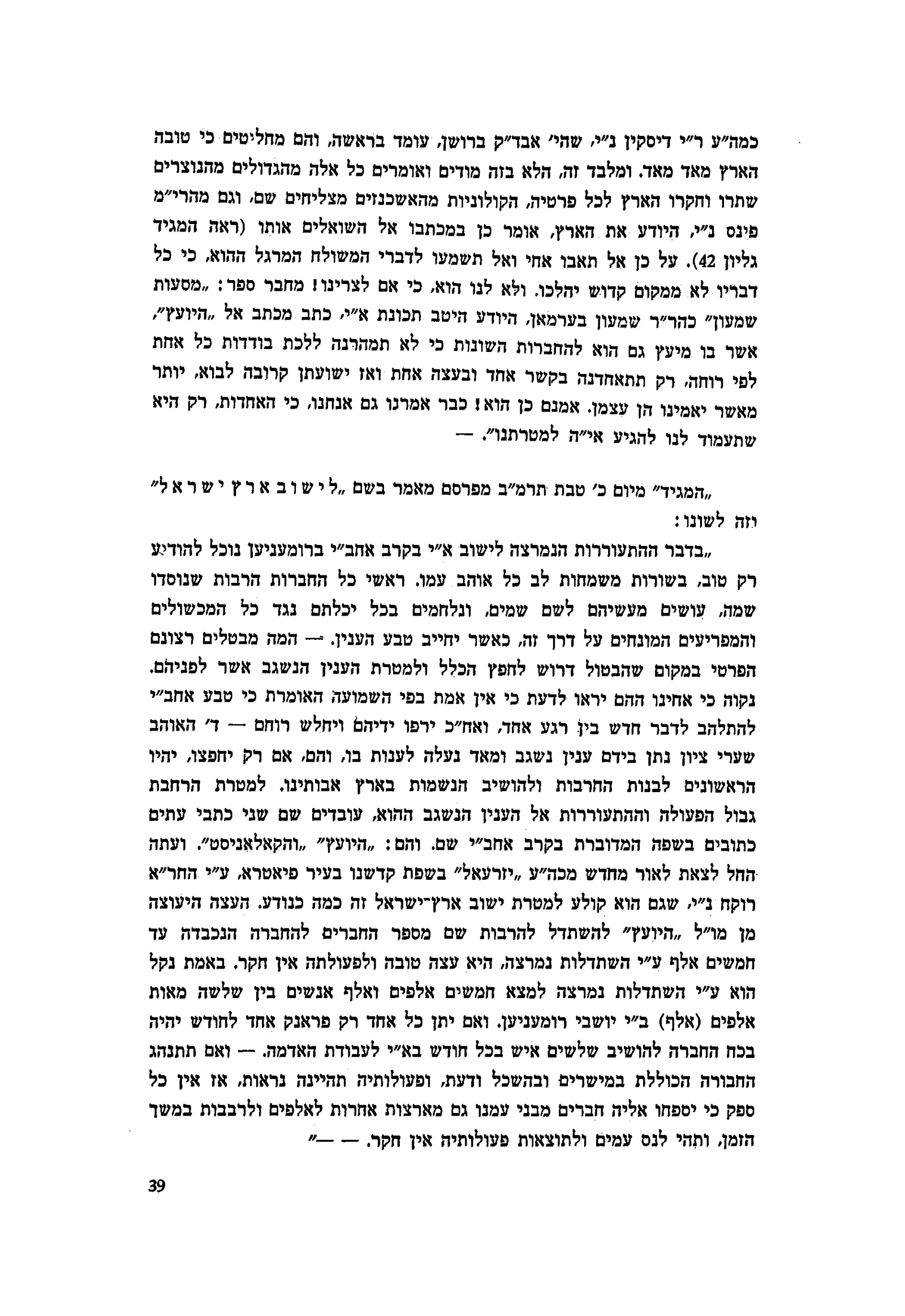 יושבי רומעניען. ואם יתן כל אחד רק פראנק אחד לחודש יהיה בכח החברה להושיב שלשים איש בכל חודש בא״י לעבודת האדמה. — ואם תתנהג החבורה הכוללת במישרים ובהשכל ודעת, ופעולותיה תהיינה נראות, אז אין כל ספק כי יספחו אליה חברים מבני עמנו גם מארצות אחרות לאלפים ולרבבות במשך הזמן, ותהי לנס עמים ולתוצאות פעולותיה אין חקר. — -״