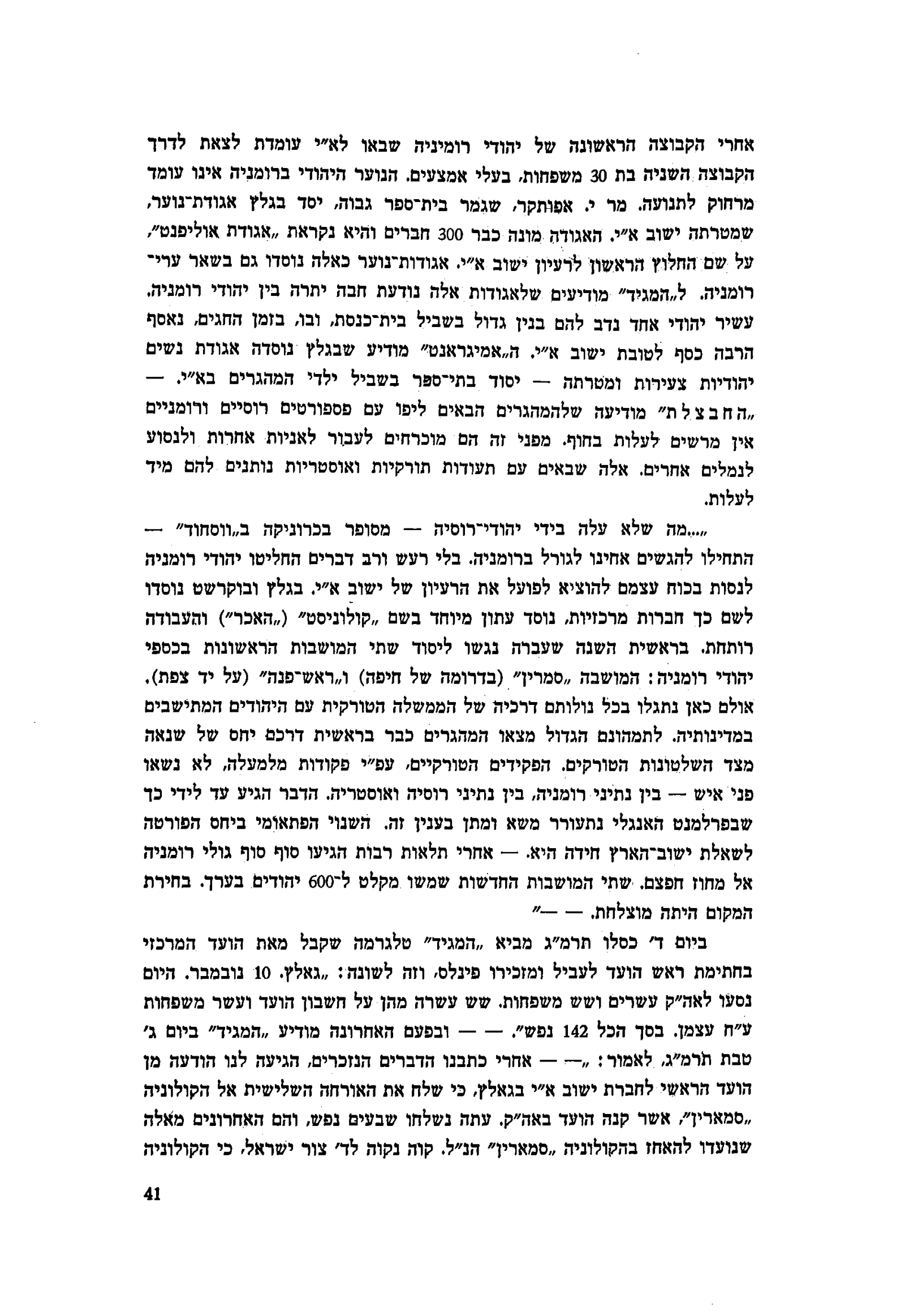 עומדת לצאת לדרך הקבוצה השניה בת 30 משפחות, בעלי אמצעים. הנוער היהודי ברומניה אינו עומד מרחוק לתנועה. מר י. אפותקר, שגמר בית־ספר גבוה, יסד בגלץ אגודת־נוער, שמטרתה ישוב א״י. האגודה מונה כבר 300 חברים והיא נקראת ״אגודת אוליפנט״ על שם החלוץ הראשון לרעיון ישוב א״י. אגודות־נוער כאלה נוסדו גם בשאר ערי־רומניה. ל״המגיד״ מודיעים שלאגודות אלה נודעת חבה יתרה בין יהודי רומניה. עשיר יהודי אחד נדב להם בנין גדול בשביל בית־כנסת, ובו, בזמן החגים, נאסף הרבה כסף לטובת ישוב א״י. ה״אמיגראנט״ מודיע שבגלץ נוסדה אגודת נשים יהודיות צעירות ומטרתה — יסוד בתי ספר בשביל ילדי המהגרים בא״י. — ״החבצלת״ מודיעה שלהמהגרים הבאים ליפו עם פספורטים רוסיים ורומניים אין מרשים לעלות בחוף. מפני זה הם מוכרחים לעבור לאניות אחרות ולנסוע לנמלים אחרים. אלה שבאים עם תעודות תורקיות ואוסטריות נותנים להם מיד לעלות.