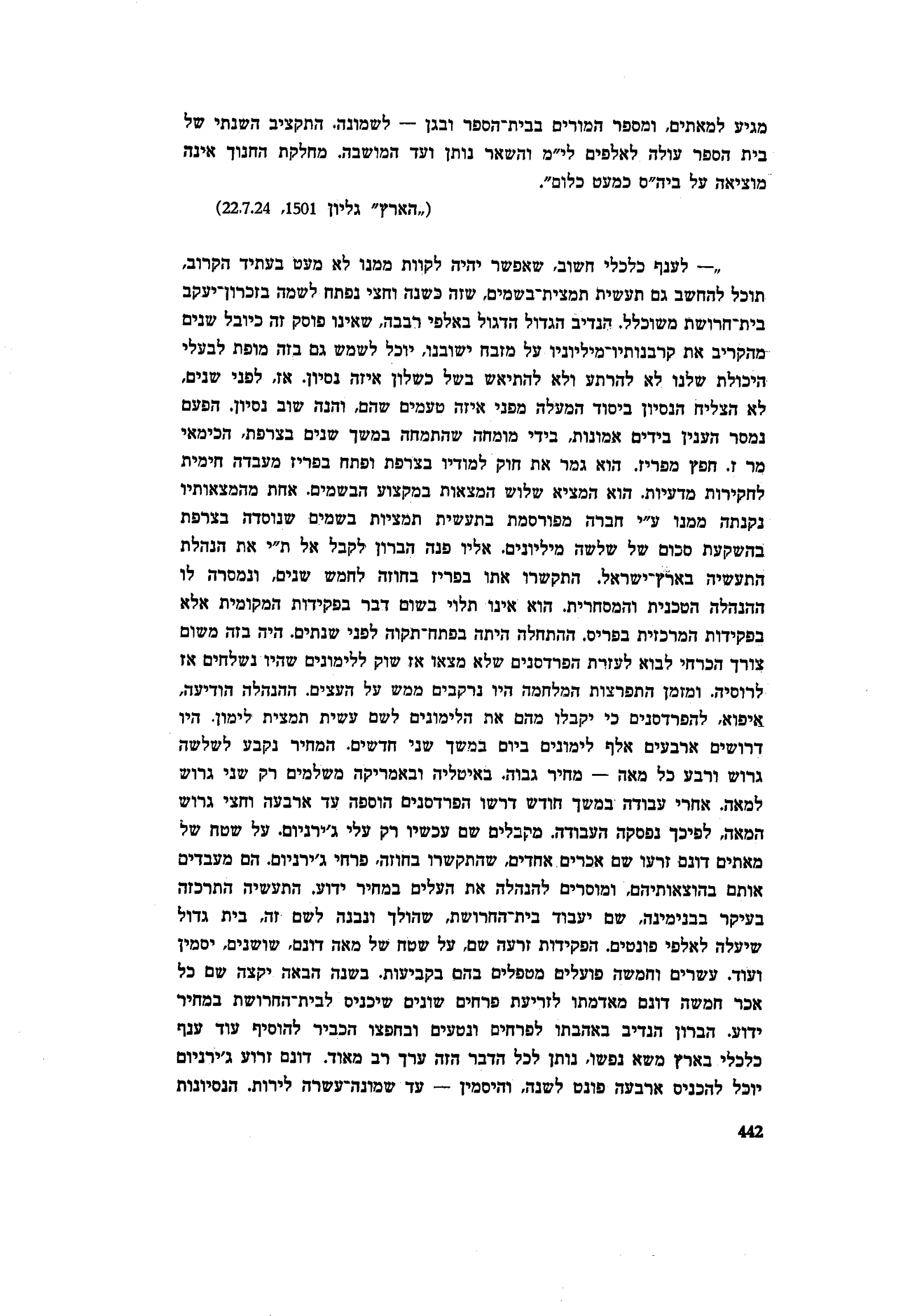 ״— לענף כלכלי חשוב, שאפשר יהיה לקוות ממנו לא מעט בעתיד הקרוב, תוכל להחשב גם תעשית תמצית־בשמים, שזה כשנה וחצי נפתח לשמה בזכרון־יעקב בית־חרושת משוכלל. הנדיב הגדול הדגול באלפי רבבה, שאינו פוסק זה כיובל שנים מהקריב את קרבנותיו־מיליוניו על מזבח ישובנו, יוכל לשמש גם בזה מופת לבעלי היכולת שלנו לא להרתע ולא להתיאש בשל כשלון איזה נסיון. אז, לפני שנים, לא הצליח הנסיון ביסוד המעלה מפני איזה טעמים שהם, והנה שוב נסיון. הפעם נמסר הענין בידים אמונות, בידי מומחה שהתמחה במשך שנים בצרפת, הכימאי מר ז. חפץ מפריז. הוא גמר את חוק למודיו בצרפת ופתח בפריז מעבדה חימית לחקירות מדעיות. הוא המציא שלוש המצאות במקצוע הבשמים. אחת מהמצאותיו נקנתה ממנו ע״י חברה מפורסמת בתעשית תמציות בשמים שנוסדה בצרפת בהשקעת סכום של שלשה מיליונים. אליו פנה הברון לקבל אל ת”י את הנהלת התעשיה בארץ־ישראל. התקשרו אתו בפריז בחוזה לחמש שנים, ונמסרה לו ההנהלה הטכנית והמסחרית. הוא אינו תלוי בשום דבר בפקידות המקומית אלא בפקידות המרכזית בפריס. ההתחלה היתה בפתח־תקוה לפני שנתיים. היה בזה משום צורך הכרחי לבוא לעזרת הפרדסנים שלא מצאו אז שוק ללימונים שהיו נשלחים אז לרוסיה. ומזמן התפרצות המלחמה היו נרקבים ממש על העצים. ההנהלה הודיעה, איפוא, להפרדסנים כי יקבלו מהם את הלימונים לשם עשית תמצית לימון. היו דרושים ארבעים אלף לימונים ביום במשך שני חדשים. המחיר נקבע לשלשה גרוש ורבע כל מאה — מחיר גבוה. באיטליה ובאמריקה משלמים רק שני גרוש למאה. אחרי עבודה במשך חודש דרשו הפרדסנים הוספה עד ארבעה וחצי גרוש המאה, לפיכך נפסקה העבודה. מקבלים שם עכשיו רק עלי ג׳ירניום. על שטח של מאתים דונם זרעו שם אכרים אחדים, שהתקשרו בחוזה, פרחי ג׳ירניום. הם מעבדים אותם בהוצאותיהם, ומוסרים להנהלה את העלים במחיר ידוע. התעשיה התרכזה בעיקר בבנימינה, שם יעבוד בית־החרושת, שהולך ונבנה לשם זה, בית גדול שיעלה לאלפי פונטים. הפקידות זרעה שם, על שטח של מאה דונם, שושנים, יסמין ועוד. עשרים וחמשה פועלים מטפלים בהם בקביעות. בשנה הבאה יקצה שם כל אכר חמשה דונם מאדמתו לזריעת פרחים שונים שיכניס לבית־החרושת במחיר ידוע. הברון הנדיב באהבתו לפרחים ונטעים ובחפצו הכביר להוסיף עוד ענף כלכלי בארץ משא נפשו, נותן לכל הדבר הזה ערך רב מאוד. דונם זרוע ג׳ירניום יוכל להכניס ארבעה פונט לשנה, והיסמין — עד שמונה־עשרה לירות. הנסיונות