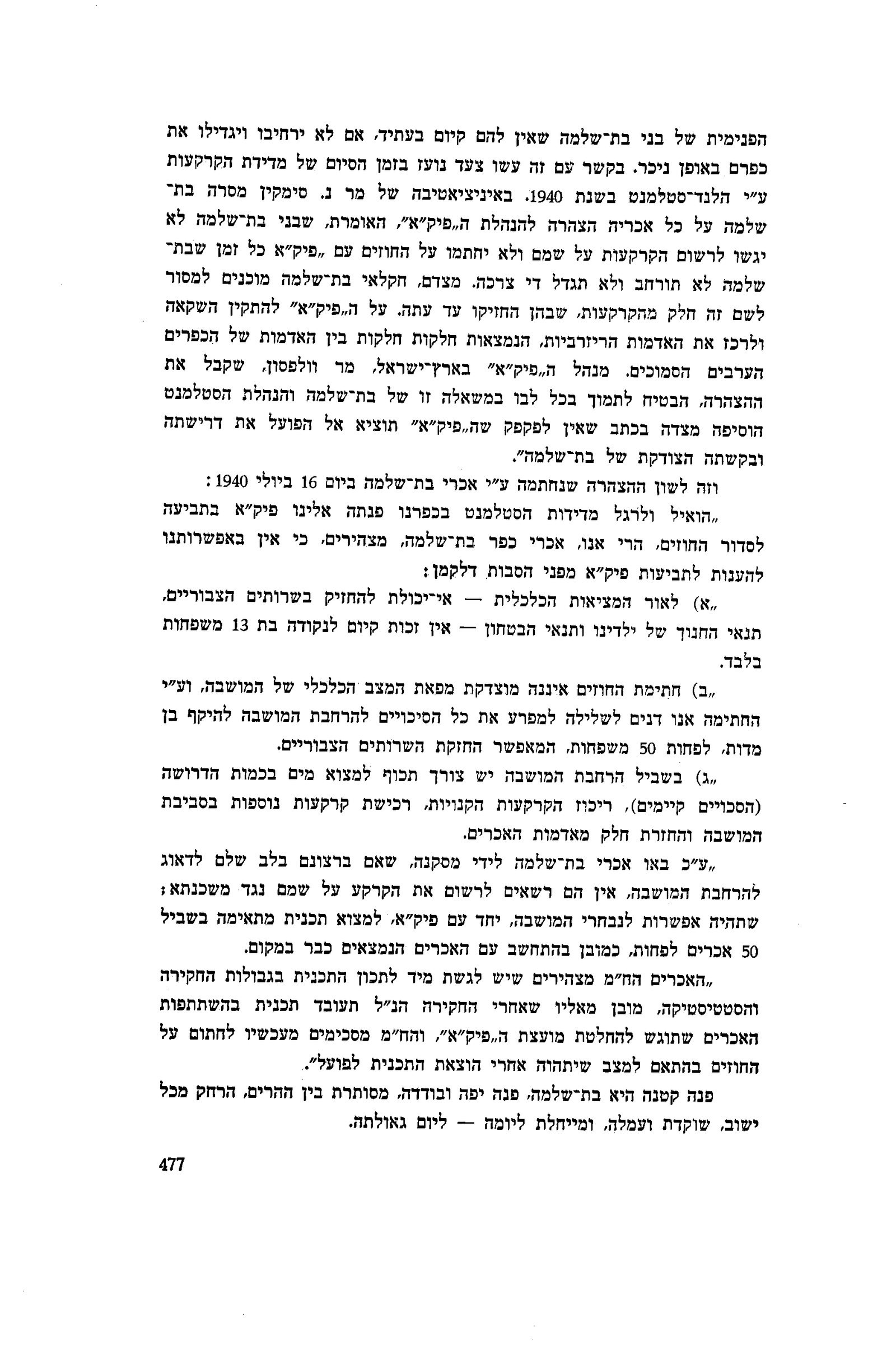 הפנימית של בני בת־שלמה שאין להם קיום בעתיד, אם לא ירחיבו ויגדילו את כפרם באופן ניכר. בקשר עם זה עשו צעד נועז בזמן הסיום של מדידת הקרקעות ע״י הלנד־סטלמנט בשנת 1940. באיניציאטיבה של מר נ. סימקין מסרה בת־שלמה על כל אכריה הצהרה להנהלת ה״פיק״א״, האומרת, שבני בת־שלמה לא יגשו לרשום הקרקעות על שמם ולא יחתמו על החוזים עם