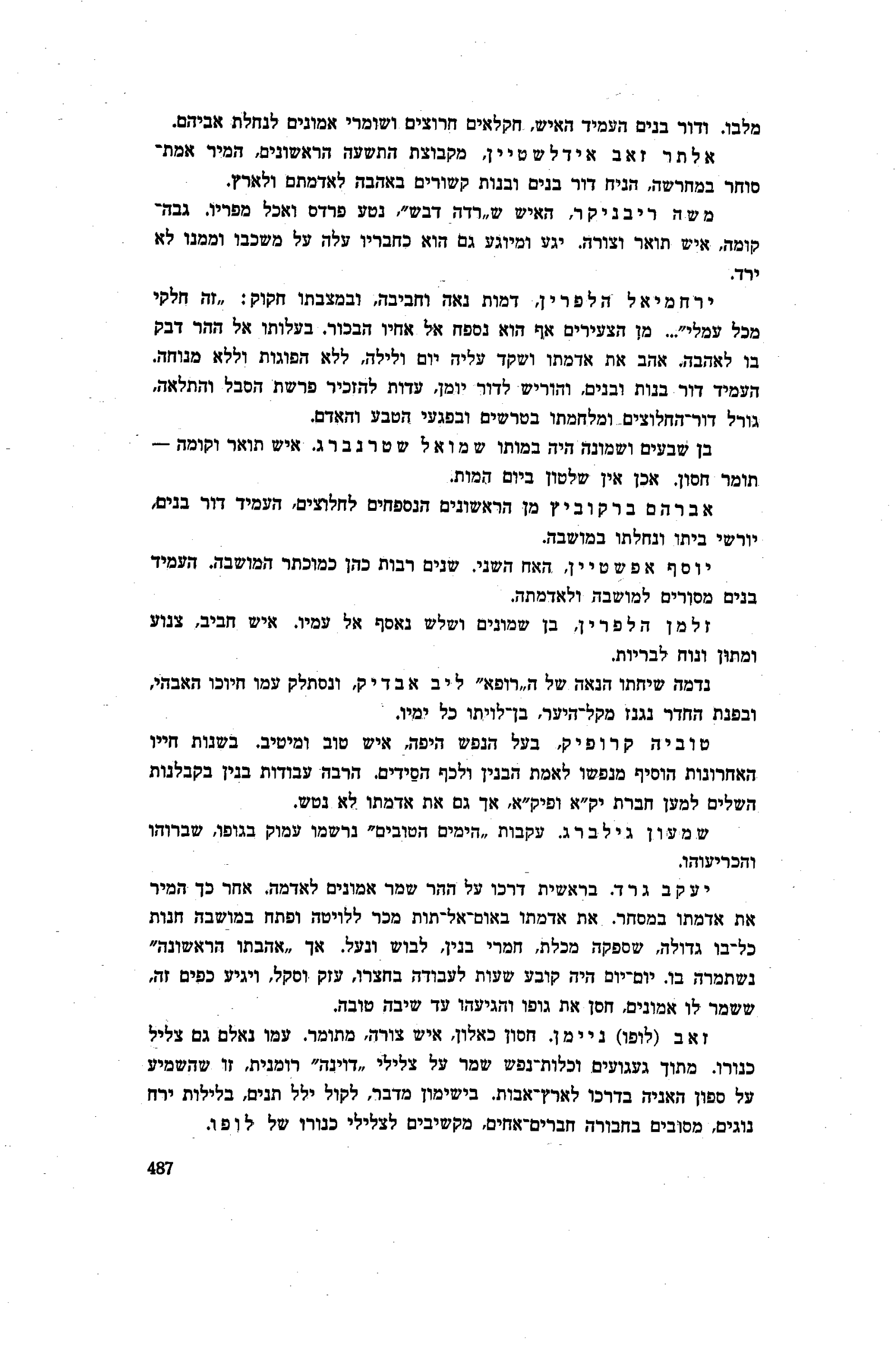 אלתר זאב אידלשטיין , מקבוצת התשעה הראשונים, המיר אמת־סוחר במחרשה, הניח דור בנים ובנות קשורים באהבה לאדמתם ולארץ.