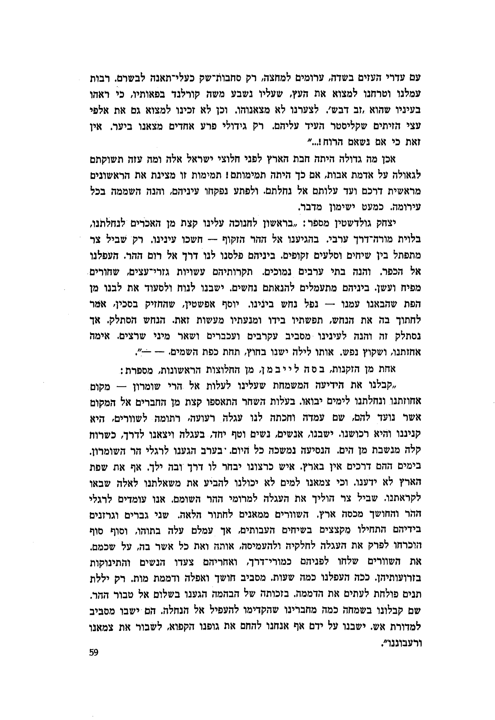 עם עדרי העזים בשדה, ערומים למחצה, רק סחבות־שק כעלי תאנה לבשרם. רבות עמלנו וטרחנו למצוא את העץ, שעליו נשבע משה קורלנד בפאותיו, כי ראהו בעיניו שהוא ׳זב דבש׳. לצערנו לא מצאנוהו, וכן לא זכינו למצוא גם את אלפי עצי הזיתים שקליסטר העיד עליהם. רק גידולי פרע אחדים מצאנו ביער. אין זאת כי אם נשאם הרוח!...״