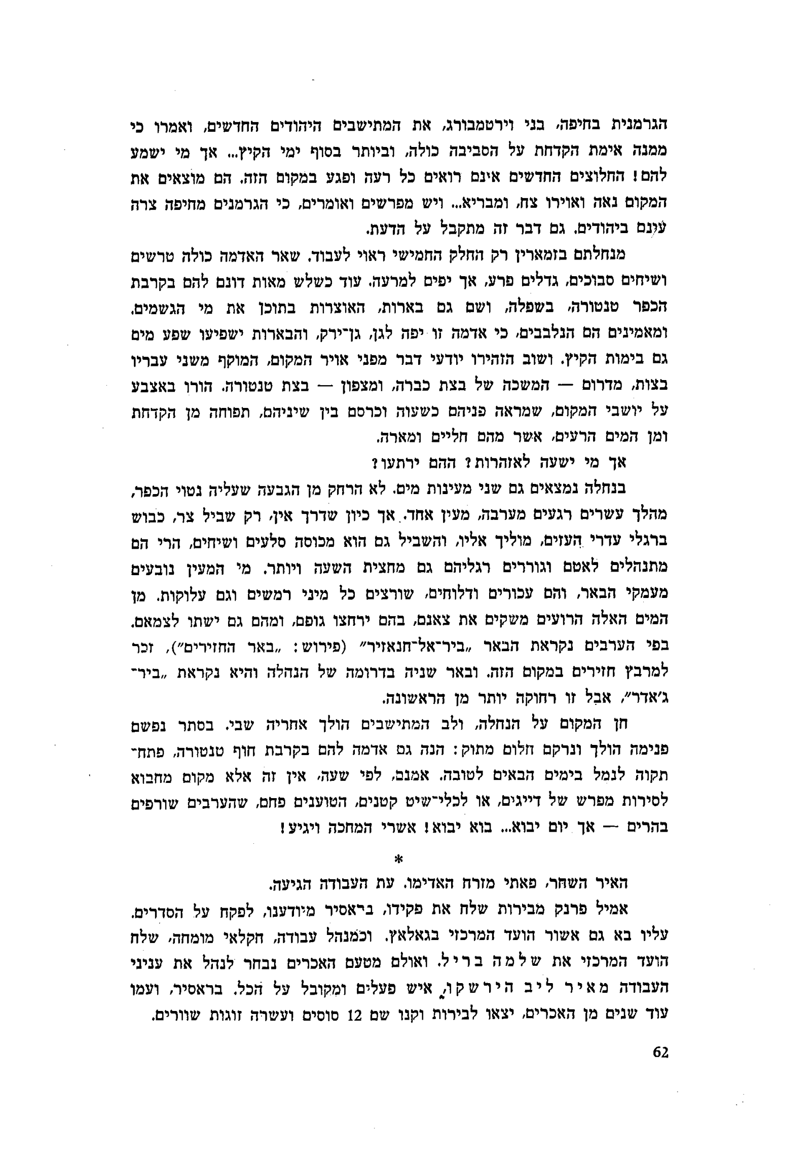 הגרמנית בחיפה, בני וירטמבורג, את המתישבים היהודים החדשים, ואמרו כי ממנה אימת הקדחת על הסביבה כולה, וביותר בסוף ימי הקיץ... אך מי ישמע להם! החלוצים החדשים אינם רואים כל רעה ופגע במקום הזה. הם מוצאים את המקום נאה ואוירו צח, ומבריא... ויש מפרשים ואומרים, כי הגרמנים מחיפה צרה עינם ביהודים. גם דבר זה מתקבל על הדעת.