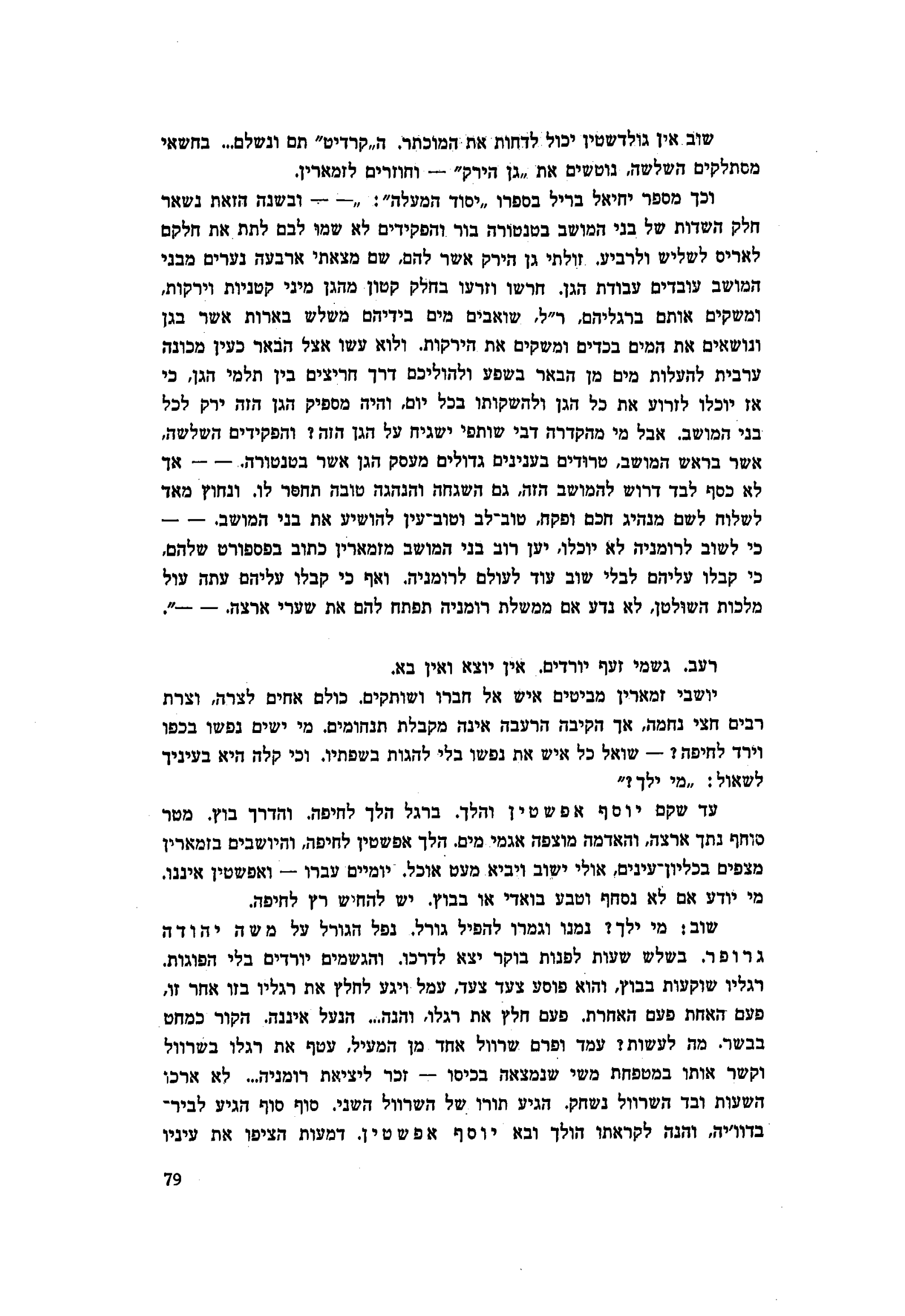 ר״ל (א) רוצה לאמר, (ב) רחמנא לִצְלָן (הרחמן יצילנו) , שואבים מים בידיהם משלש בארות אשר בגן ונושאים את המים בכדים ומשקים את הירקות. ולוא עשו אצל הבאר כעין מכונה ערבית להעלות מים מן הבאר בשפע ולהוליכם דרך חריצים בין תלמי הגן, כי אז יוכלו לזרוע את כל הגן ולהשקותו בכל יום, והיה מספיק הגן הזה ירק לכל בני המושב, אבל מי מהקדרה דבי שותפי ישגיח על הגן הזה? והפקידים השלשה, אשר בראש המושב, טרודים בענינים גדולים מעסק הגן אשר בטנטורה. — — אך לא כסף לבד דרוש להמושב הזה, גם השגחה והנהגה טובה תחסר לו. ונחוץ מאד לשלוח לשם מנהיג חכם ופקח, טוב־לב וטוב־עין להושיע את בני המושב. — — כי לשוב לרומניה לא יוכלו, יען רוב בני המושב מזמארין כתוב בפספורט שלהם, כי קבלו עליהם לבלי שוב עוד לעולם לרומניה. ואף כי קבלו עליהם עתה עול מלכות השולטן, לא נדע אם ממשלת רומניה תפתח להם את שערי ארצה. - -״.