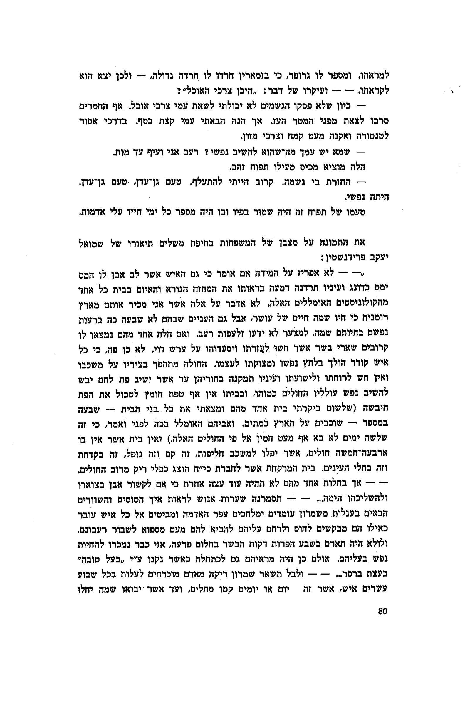 ״— — לא אפריז על המידה אם אומר כי גם האיש אשר לב אבן לו המס ימס כדונג ועיניו תרדנה דמעה בראותו את המחזה הנורא והאיום בבית כל אחד מהקולוניסטים האומללים האלה. לא אדבר על אלה אשר אני מכיר אותם מארץ רומניה כי חיו שמה חיים של עושר, אבל גם העניים שבהם לא שבעה כה ברעות נפשם בהיותם שמה, למצער לא ידעו זלעפות רעב. ואם חלה אחד מהם נמצאו לו קרובים שארי בשר אשר חשו לעזרתו ויסעדוהו על ערש דוי. לא כן פה, כי כל איש קודר הולך בלחץ נפשו ומצוקתו לעצמו. החולה מתהפך בציריו על משכבו ואין חש לרוחתו ולישועתו ועיניו תמקנה בחוריהן עד אשר ישיג פת לחם יבש להשיב נפש עולליו החולים כמוהו, ובביתו אין אף טפת חומץ לטבול את הפת היבשה (שלשום ביקרתי בית אחד מהם ומצאתי את כל בני הבית — שבעה במספר — שוכבים על הארץ כמתים. ואביהם האומלל בכה לפני ואמר, כי זה שלשה ימים לא בא אף מעט חמין אל פי החולים האלה.) ואין בית אשר אין בו ארבעה־חמשה חולים, אשר יפלו למשכב חליפות, זה קם וזה נופל, זה בקדחת וזה בחלי העינים. בית המרקחת אשר לחברת