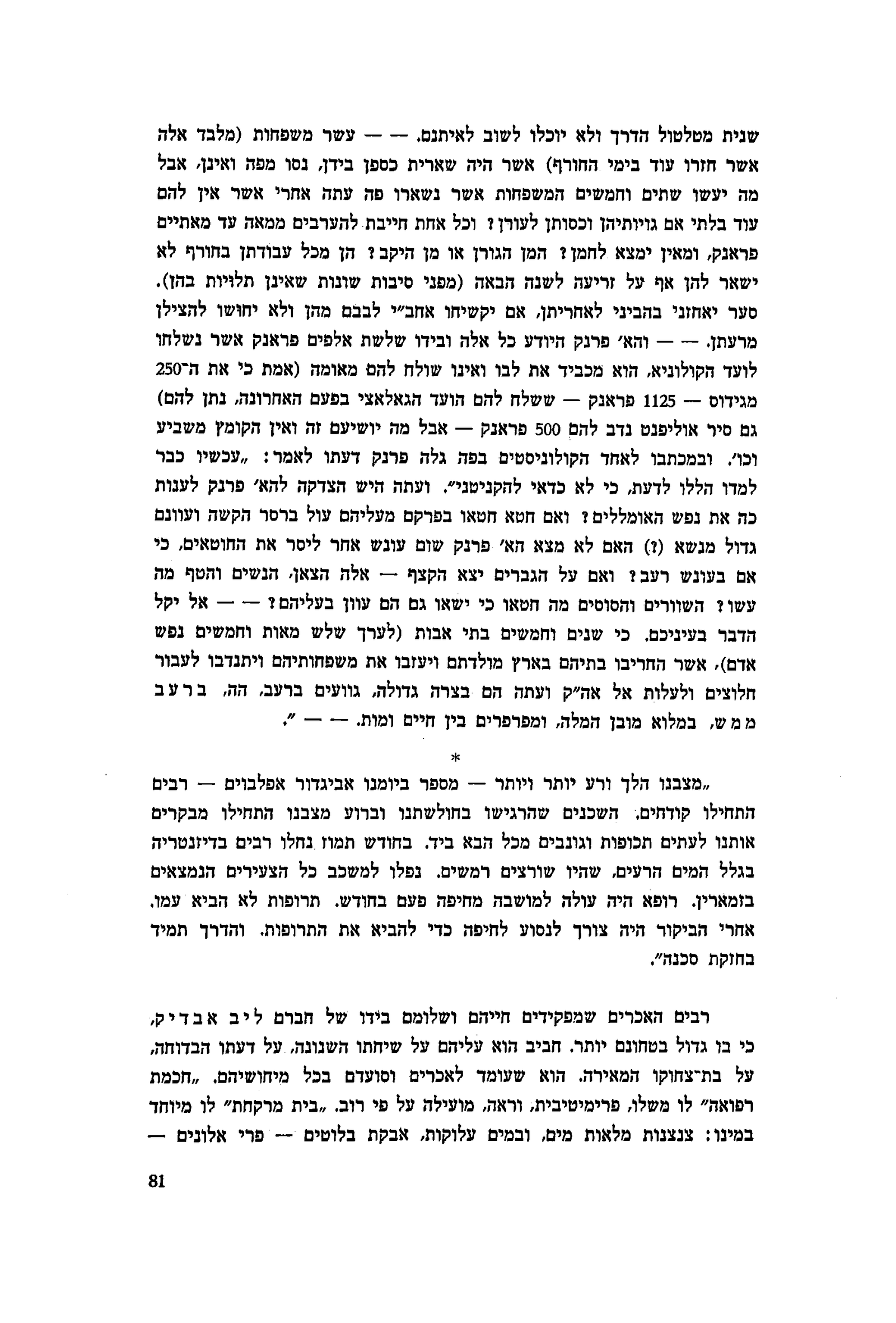 לבבם מהן ולא יחושו להצילן מרעתן. — — והא׳ פרנק היודע כל אלה ובידו שלשת אלפים פראנק אשר נשלחו לועד הקולוניא, הוא מכביד את לבו ואינו שולח להם מאומה (אמת כי את ה־250 מגידוס — 1125 פראנק — ששלח להם הועד הגאלאצי בפעם האחרונה, נתן להם) גם סיר אוליפנט נדב להם 500 פראנק — אבל מה יושיעם זה ואין הקומץ משביע וכו׳. ובמכתבו לאחד הקולוניסטים בפה גלה פרנק דעתו לאמר: ״עכשיו כבר למדו הללו לדעת, כי לא כדאי להקניטני״. ועתה היש הצדקה להא׳ פרנק לענות כה את נפש האומללים? ואם חטא חטאו בפרקם מעליהם עול ברסר הקשה ועוונם גדול מנשא (?) האם לא מצא