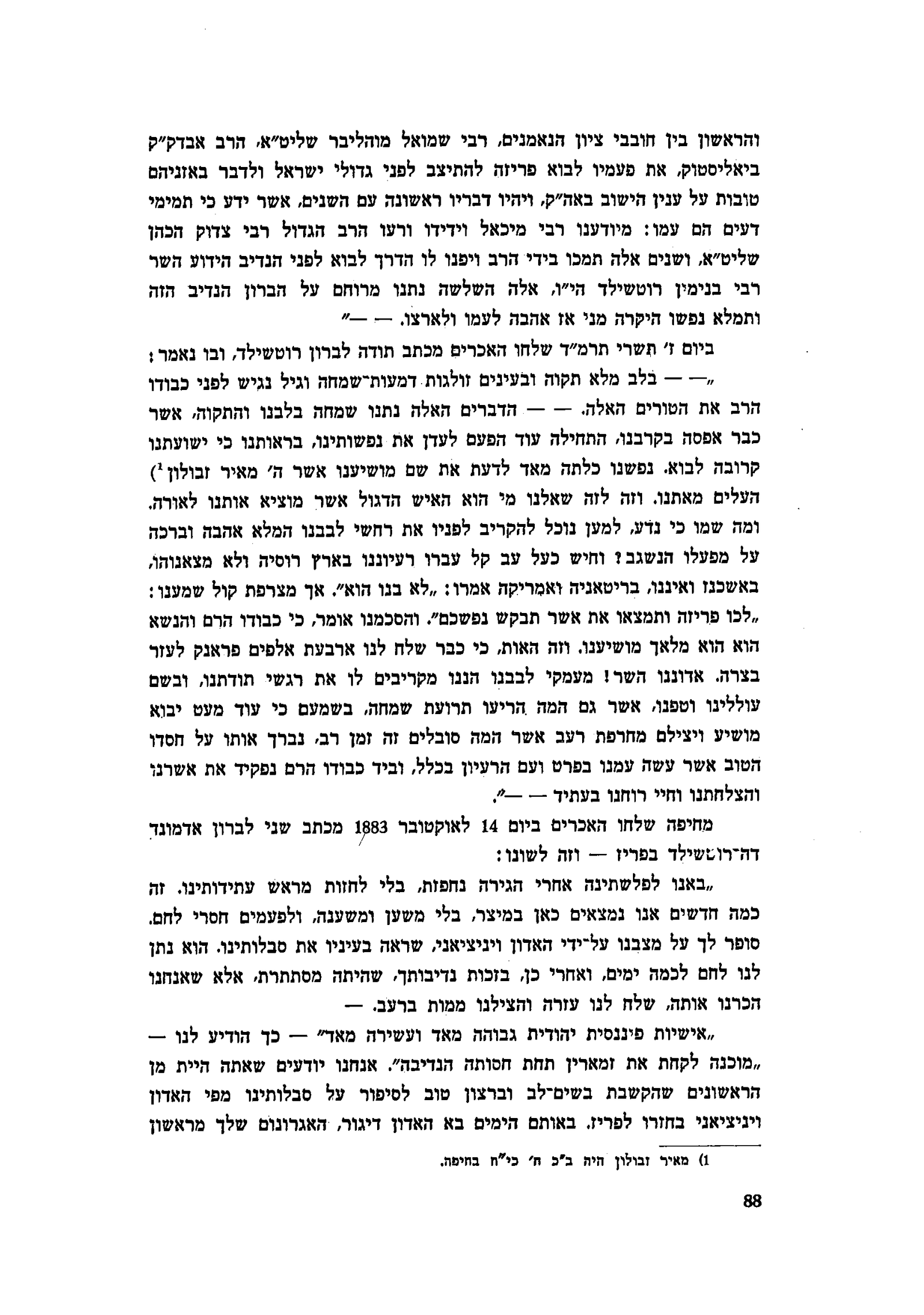 1 ) העלים מאתנו. וזה לזה שאלנו מי הוא האיש הדגול אשר מוציא אותנו לאורה. ומה שמו כי נדע, למען נוכל להקריב לפניו את רחשי לבבנו המלא אהבה וברכה על מפעלו הנשגב? וחיש כעל עב קל עברו רעיוננו בארץ רוסיה ולא מצאנוהו, באשכנז ואיננו, בריטאניה ואמריקה אמרו: ״לא בנו הוא״. אך מצרפת קול שמענו: ״לכו פריזה ותמצאו את אשר תבקש נפשכם״. והסכמנו אומר, כי כבודו הרם והנשא הוא הוא מלאך מושיענו. וזה האות, כי כבר שלח לנו ארבעת אלפים פראנק לעזר בצרה. אדוננו השר! מעמקי לבבנו הננו מקריבים לו את רגשי תודתנו, ובשם עוללינו וטפנו, אשר גם המה הריעו תרועת שמחה, בשמעם כי עוד מעט יבוא מושיע ויצילם מחרפת רעב אשר המה סובלים זה זמן רב, נברך אותו על חסדו הטוב אשר עשה עמנו בפרט ועם הרעיון בכלל, וביד כבודו הרם נפקיד את אשרנו והצלחתנו וחיי רוחנו בעתיד - -״.