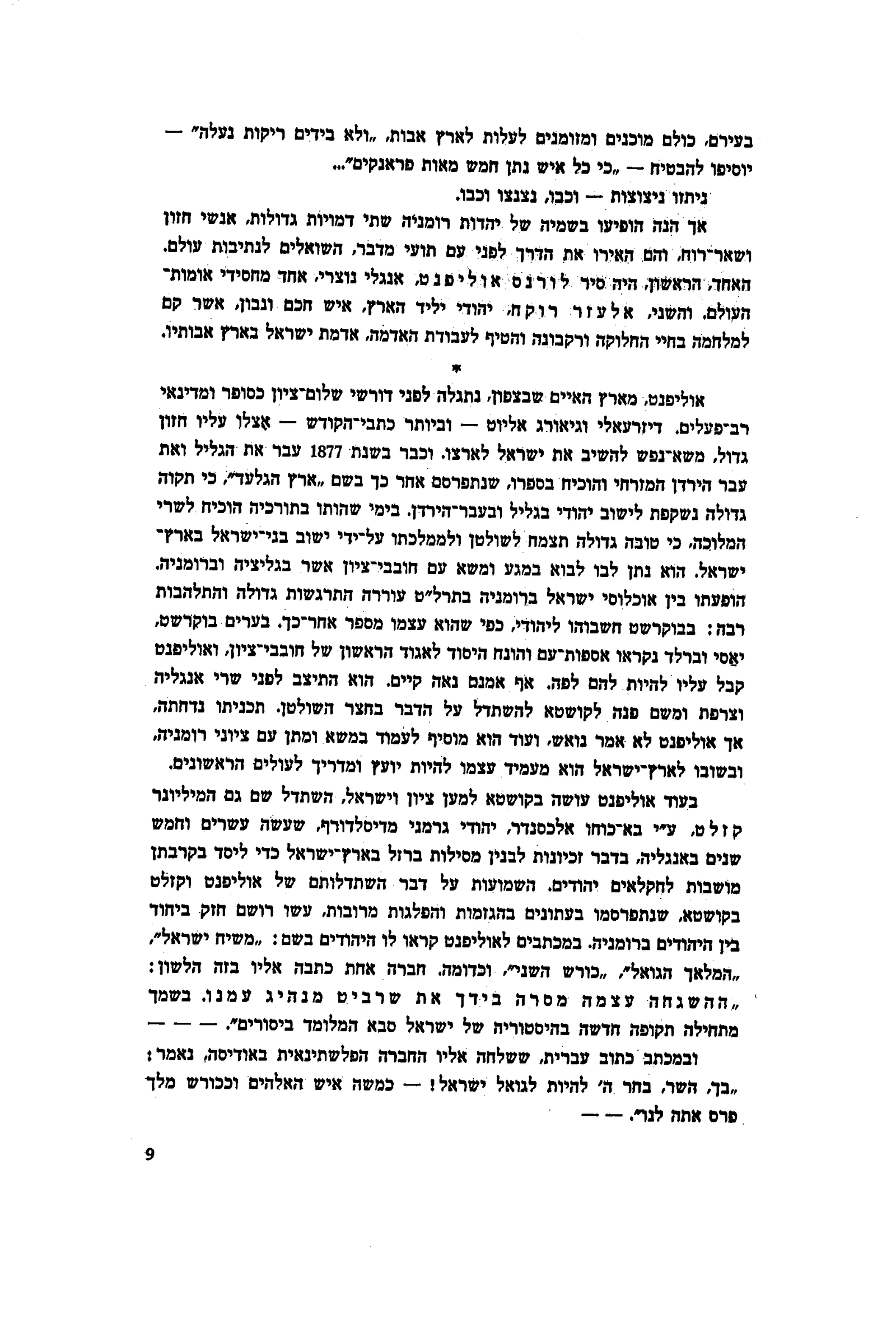 אוליפנט, מארץ האיים שבצפון, נתגלה לפני דורשי שלום־ציון כסופר ומדינאי רב־פעלים. דיזרעאלי וגיאורג אליוט — וביותר כתבי־הקודש — אצלו עליו חזון גדול, משא־נפש להשיב את ישראל לארצו. וכבר בשנת 1877 עבר את הגליל ואת עבר הירדן המזרחי והוכיח בספרו, שנתפרסם אחר כך בשם ״ארץ הגלעד״, כי תקוה גדולה נשקפת לישוב יהודי בגליל ובעבר־הירדן. בימי שהותו בתורכיה הוכיח לשרי המלוכה, כי טובה גדולה תצמח לשולטן ולממלכתו על־ידי ישוב בני־ישראל בארץ־ישראל. הוא נתן לבו לבוא במגע ומשא עם חובבי־ציון אשר בגליציה וברומניה. הופעתו בין אוכלוסי ישראל ברומניה בתרל״ט עוררה התרגשות גדולה והתלהבות רבה: בבוקרשט חשבוהו ליהודי, כפי שהוא עצמו מספר אחר־כך. בערים בוקרשט, יאסי וברלד נקראו אספות־עם והונח היסוד לאגוד הראשון של חובבי־ציון, ואוליפנט קבל עליו להיות להם לפה. אף אמנם נאה קיים. הוא התיצב לפני שרי אנגליה וצרפת ומשם פנה לקושטא להשתדל על הדבר בחצר השולטן. תכניתו נדחתה, אך אוליפנט לא אמר נואש, ועוד הוא מוסיף לעמוד במשא ומתן עם ציוני רומניה, ובשובו לארץ־ישראל הוא מעמיד עצמו להיות יועץ ומדריך לעולים הראשונים.